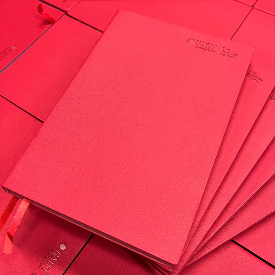 Bộ quà tặng được thiết kế với tông đỏ đặc trưng của RMIT, kết hợp logo được in sắc nét trên từng sản phẩm. Sự đồng bộ trong màu sắc và họa tiết không chỉ thể hiện tính thẩm mỹ cao mà còn giúp sinh viên cảm nhận rõ hơn niềm tự hào thương hiệu RMIT trong từng chi tiết nhỏ.